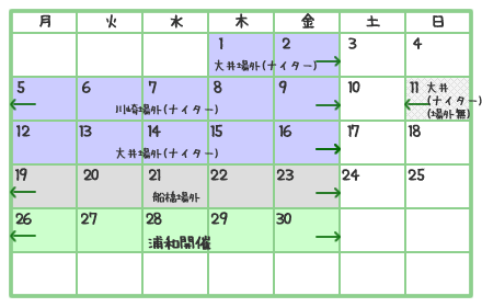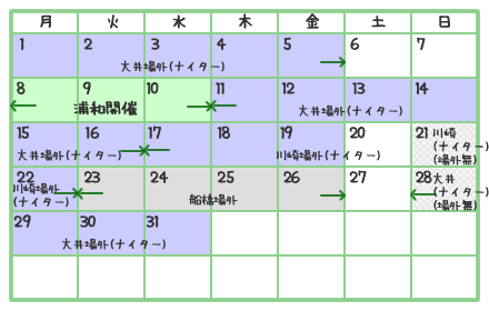 南関東競馬場(浦和、大井、川崎、船橋)にて開催される競馬の日程表です。
